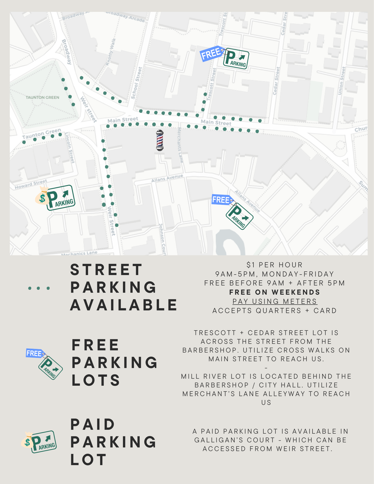 All parking lots are within a few minutes walking distance to the barbershop.